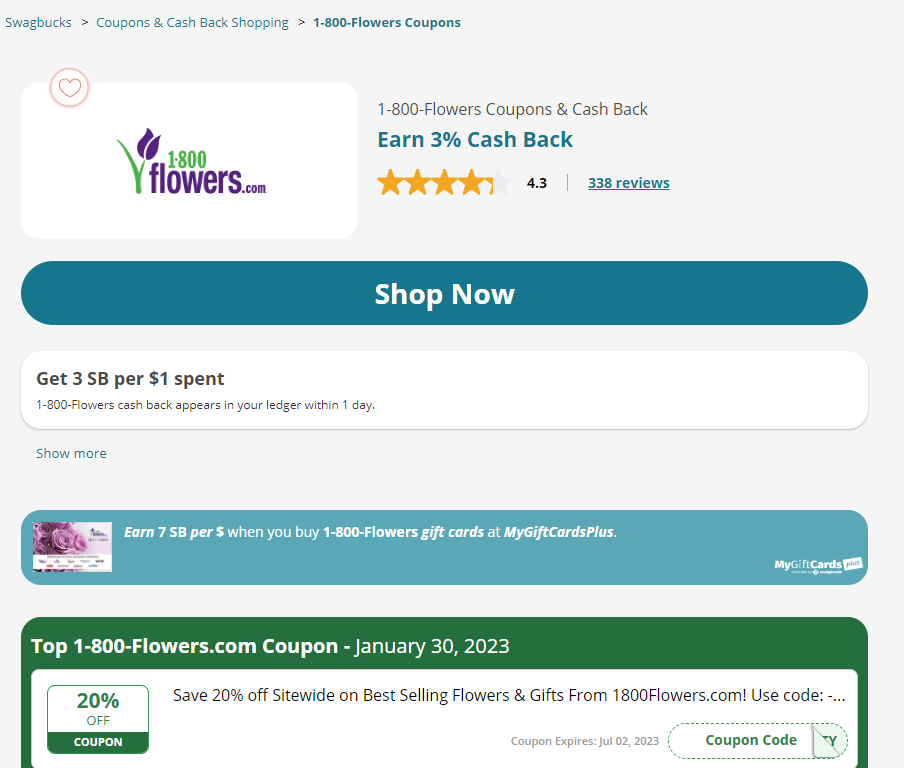 With these featured floral retailers, you can save money with promo codes and get free cash-back rebates. Get up to 1% to 10% cash back, or a set cash back bonus of $12.50. Just visit the retailer’s site through the link on Swagbucks.