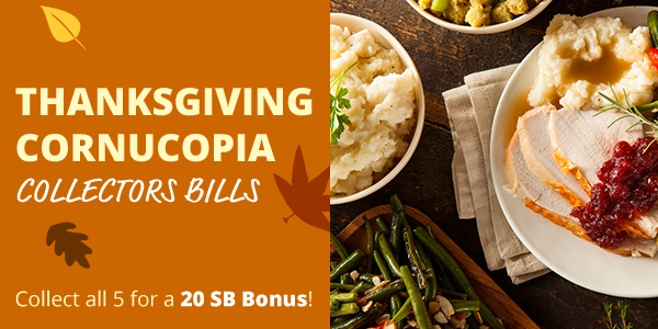 Collect all 5 Thanksgiving Meal-themed Collector’s Bills and you’ll earn a 20 SB bonus!